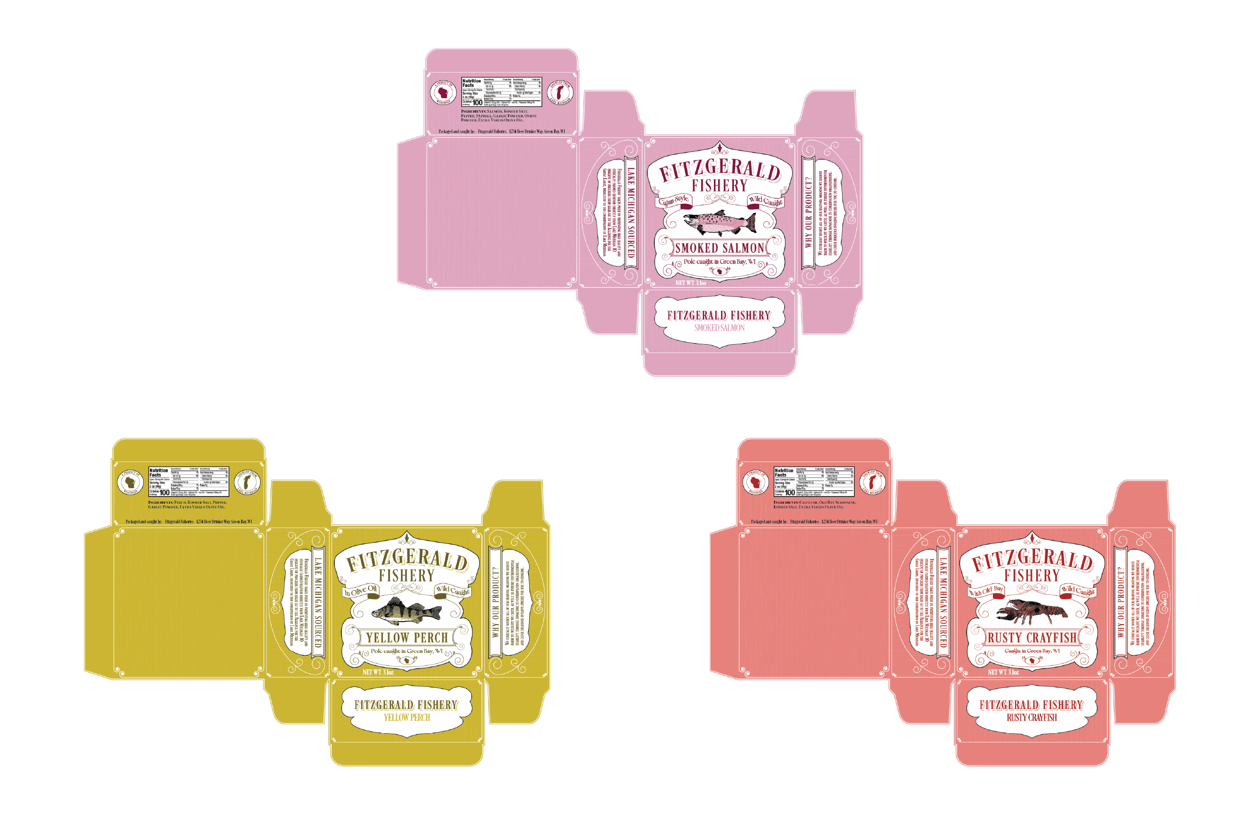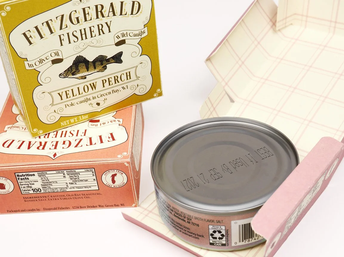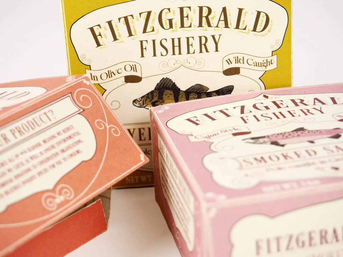 Fitzgerald Fishery was inspired by my own life experiences growing up in Wisconsin. Wisconsinites are very proud of their brands and will support them to the enth degree. The goal was to create a brand that felt familiar to someone from Wisconsin. Given the rich historical contexts of Wisconsin, these packages were inspired by different packages of the 19th and early 20th century while still retaining a touch of modernity and a sense of human touch, with the marine species illustrations done in brush pen.