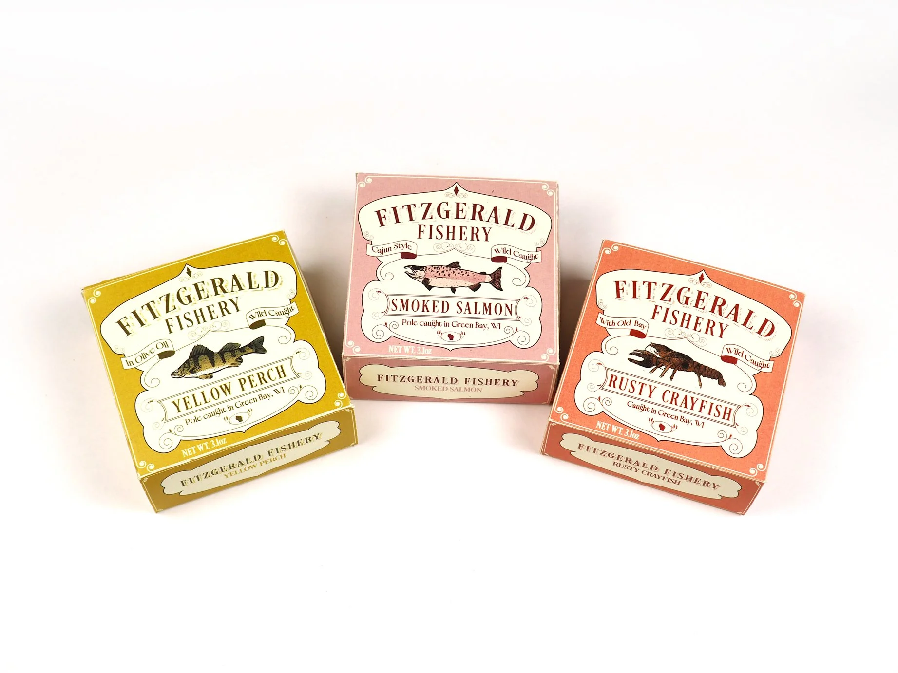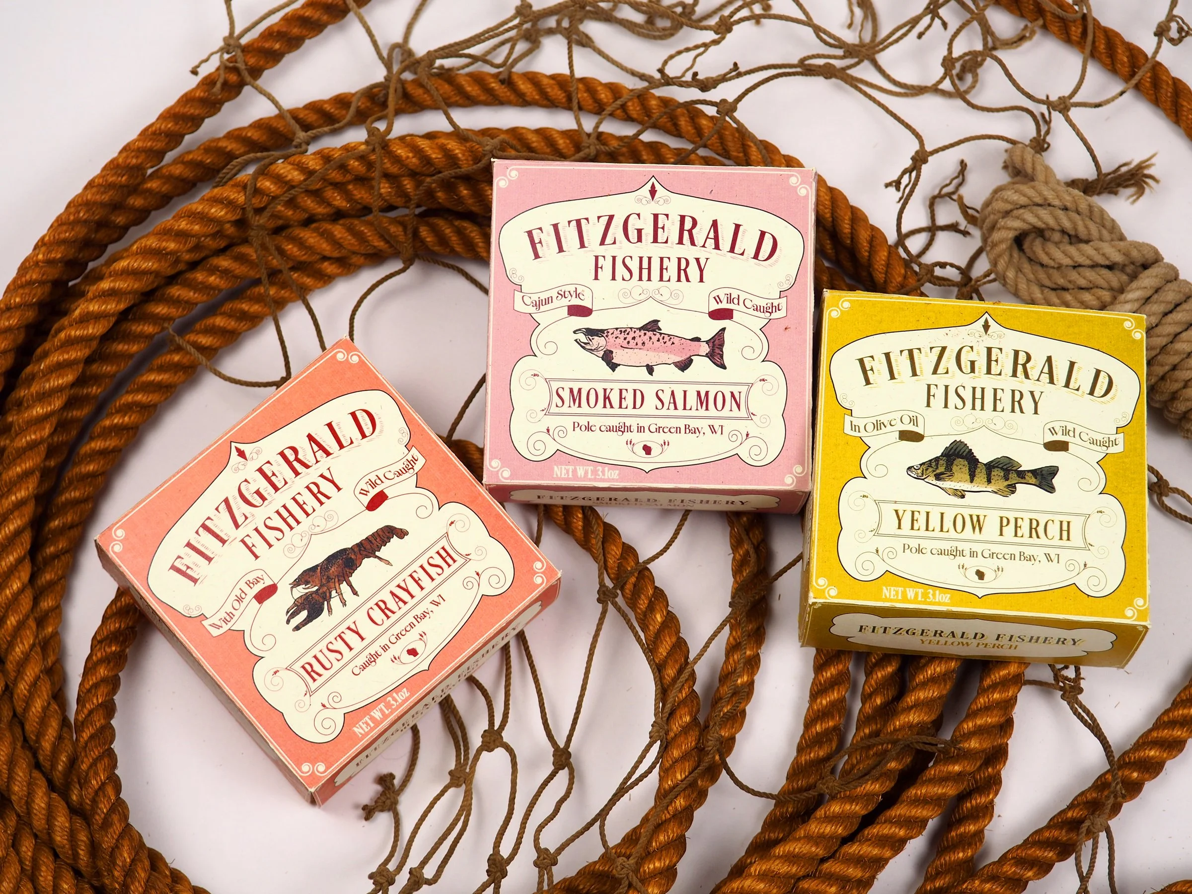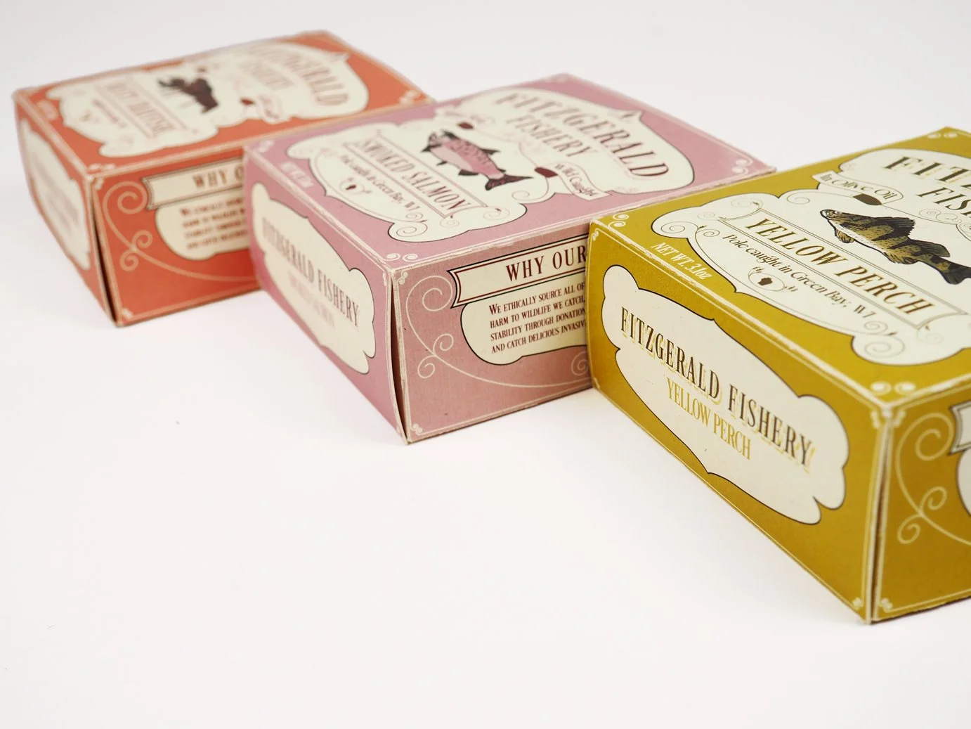 Fitzgerald Fishery was inspired by my own life experiences growing up in Wisconsin. Wisconsinites are very proud of their brands and will support them to the enth degree. The goal was to create a brand that felt familiar to someone from Wisconsin. Given the rich historical contexts of Wisconsin, these packages were inspired by different packages of the 19th and early 20th century while still retaining a touch of modernity and a sense of human touch, with the marine species illustrations done in brush pen.