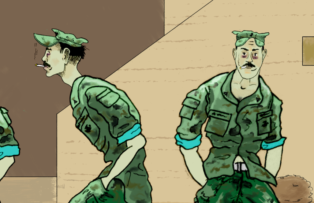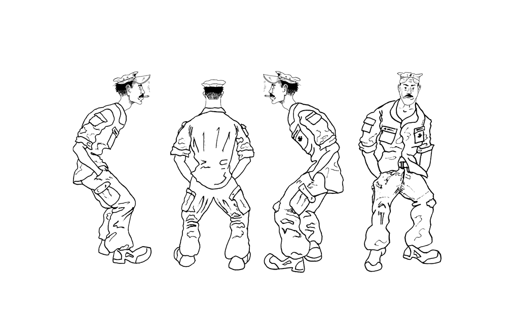 Lance Corporal Schmuckatelli is not necessarily an original character, and this Marine lives prominently within Marine Corps lore. He is notorious for making poor decisions, among not representing the Marine Corps in the brightest light, and for that reason, he is represented as such. Despite this, he still wears the Purple Heart and Combat Action Ribbon on his Service Charlie uniform, possibly hinting at the traumatization that has caused him to lose some sanity. Through it all, Lcpl Schmuckatelli remains steadfast in his Grizzly chewing tobacco and Marlboro 99 habits.